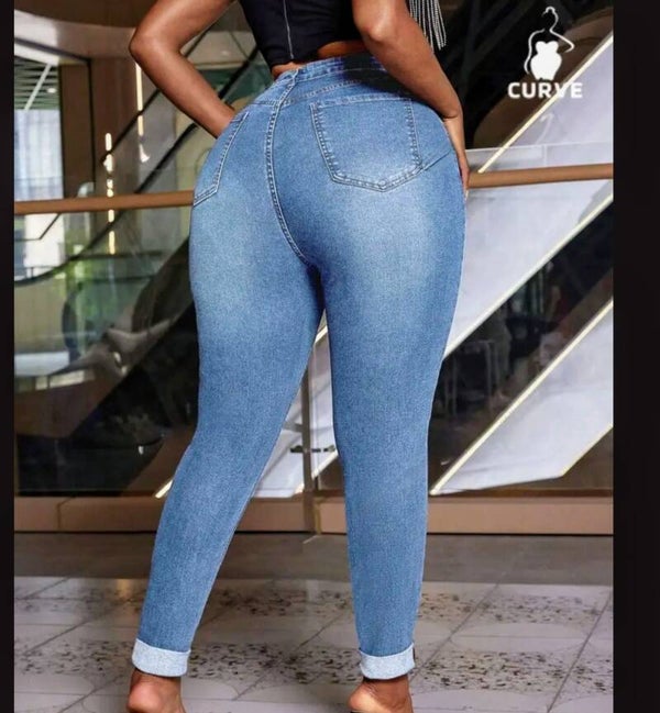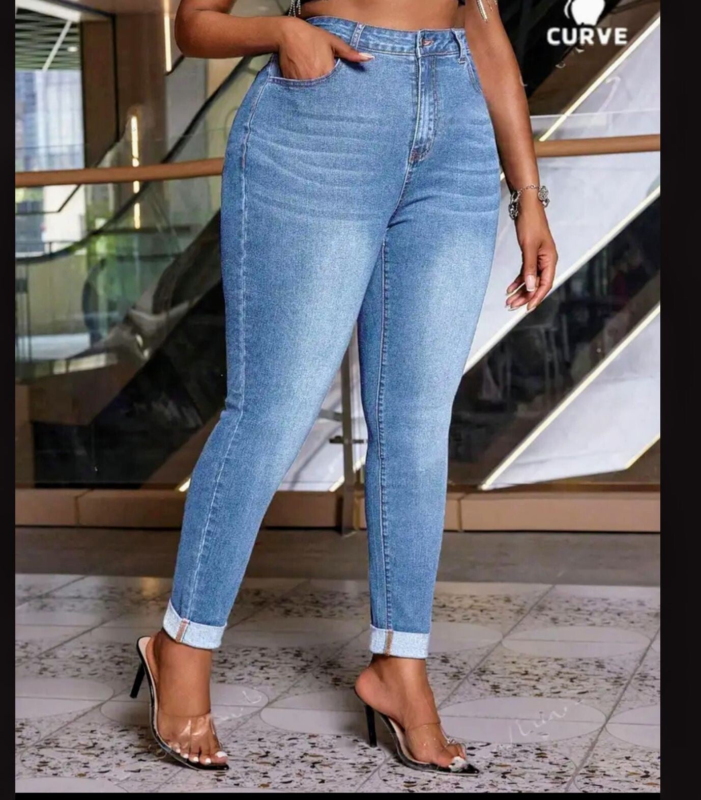 Women's Curvy Jeans w/Cuffs - Medium Blue